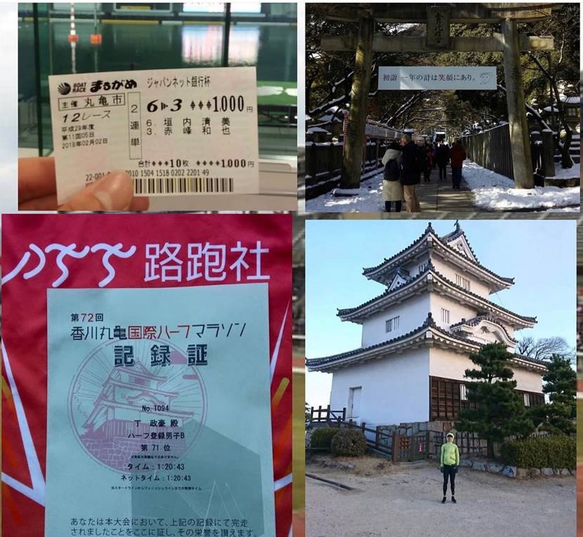 2018年,再次挑戰香川丸龜是因為希望能夠突破1:20分,對我來說是當時的大關,這一次比較沒有對各種事物感到新奇的興奮感,而是希望能夠好好把比賽跑好,比賽當天卻突然下起了雪,讓我感到非常焦慮不安。但還好實際上下雪,比起下大雨還感覺沒這麼冷,只要熱身開了感受上影響是不致於這麼大,雖然這場比賽又有突破一點,不過在雪中跑步聽起來真是新奇又浪漫,但這種情節還是看電視上別人跑就好了。沒有突破1:20分,這也促成了第三次挑戰。